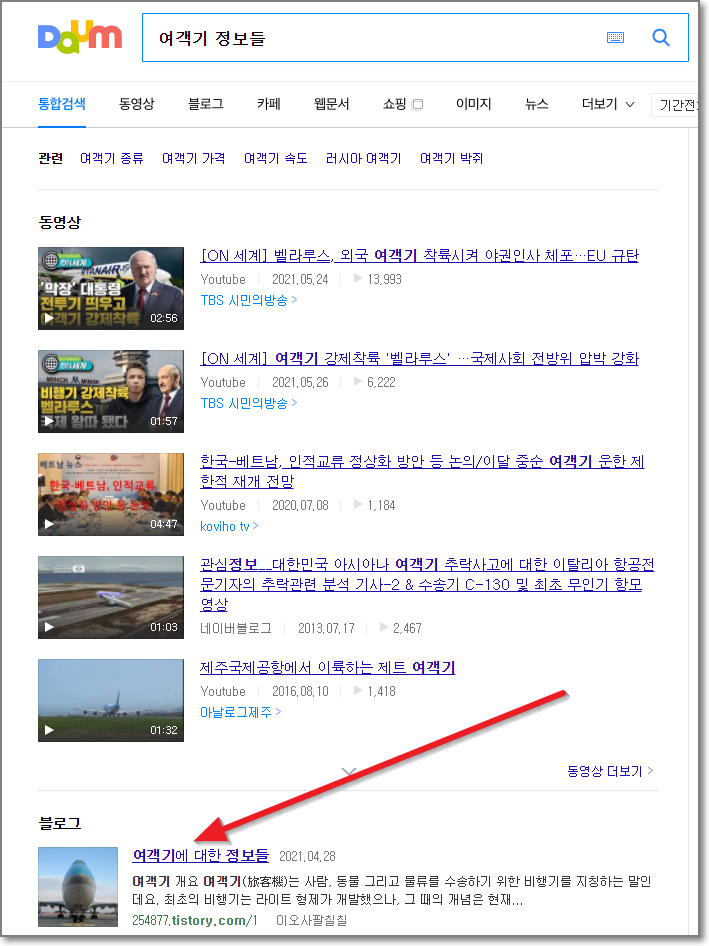 다음에서 "여객기 정보들"이라고 검색하면 블로그중에서 최상단에 검색이 됩니다. 이것이 최적화된 블로그라는 것입니다.